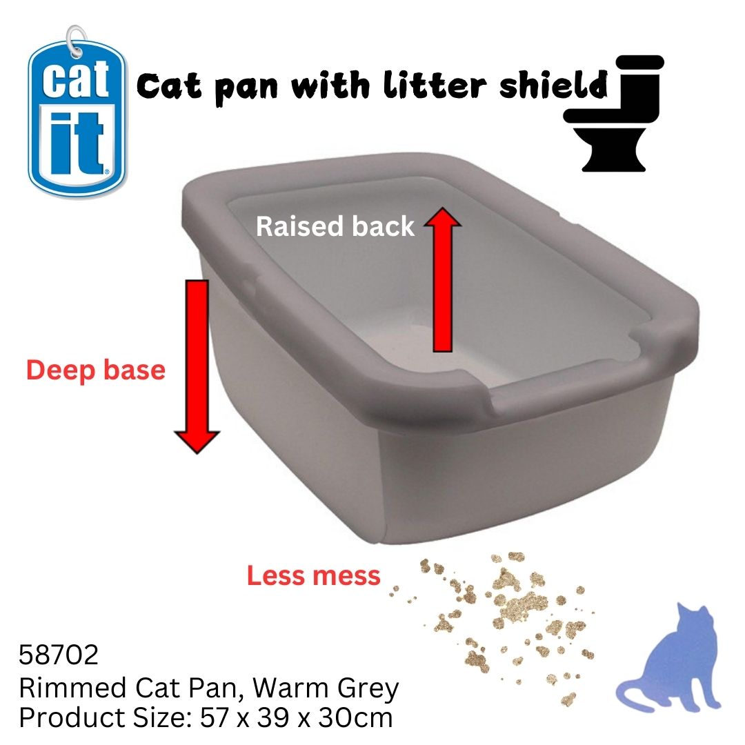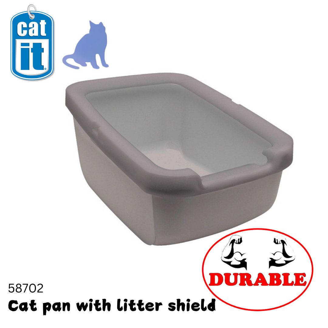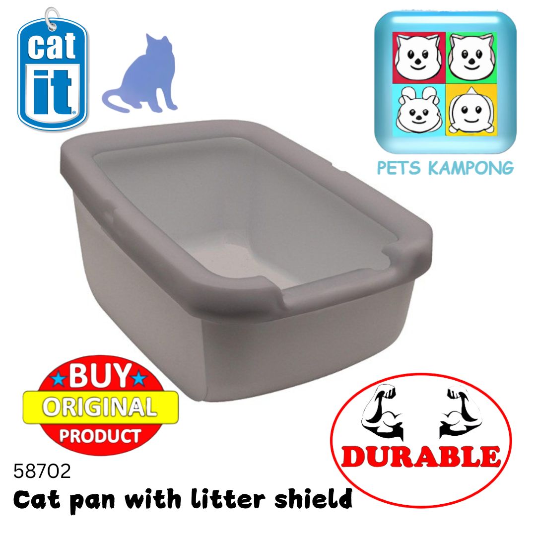 Catit cat pan with litter shield rim combines a deep base and raised back to help retain litter inside the pan for less mess. The added rim acts as a shield to further prevent waste from spilling out of the pan. The built-in bag anchor keeps the bag. Open and free hand for scooping and suitable for all types of litter. Durable Mess-free Trusty brand Product Size: 57 x 39 x 30cm