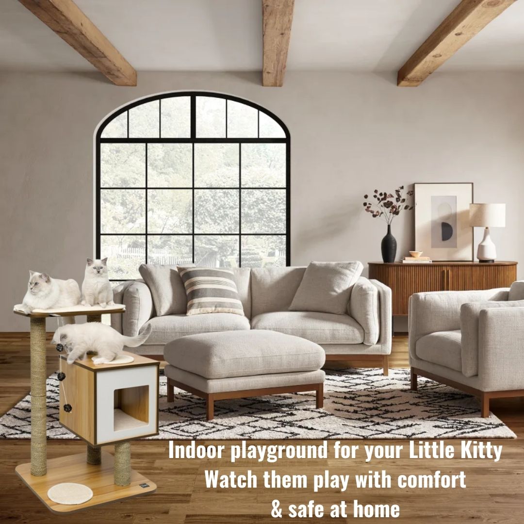Catit Vesper Cat Furniture V-High Base is an excellent observation deck for cats who love to sit up high. The tall and slim scratching poles encourage extensive scratching in an elongated posture, while the cubed den provides a cosy space for a nap.