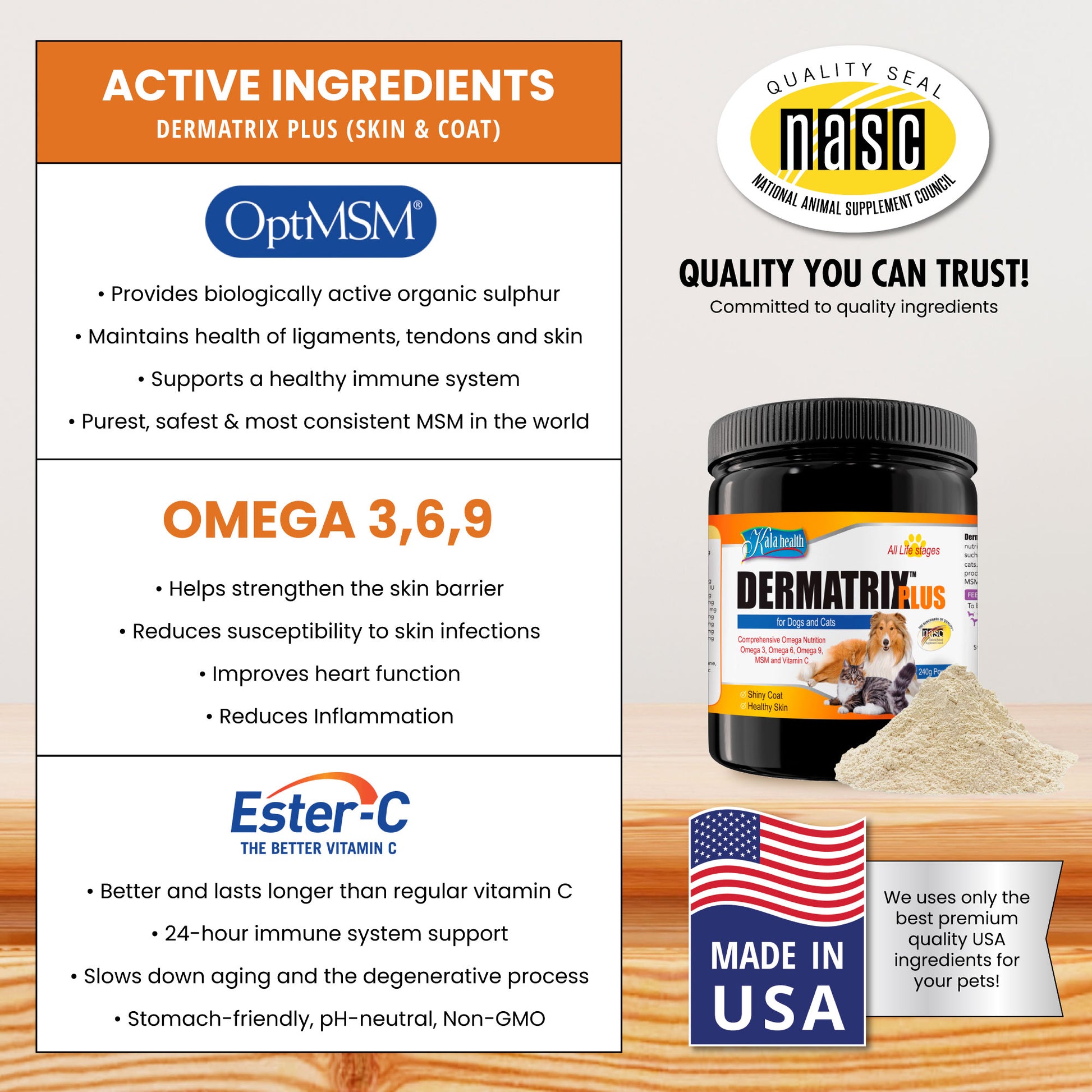 DERMATRIX® Plus is an oral supplement designed to provide the nutrition required to enhance the skin and coat health of dogs and cats, such as to heal red, itchy, or flaking skin naturally.