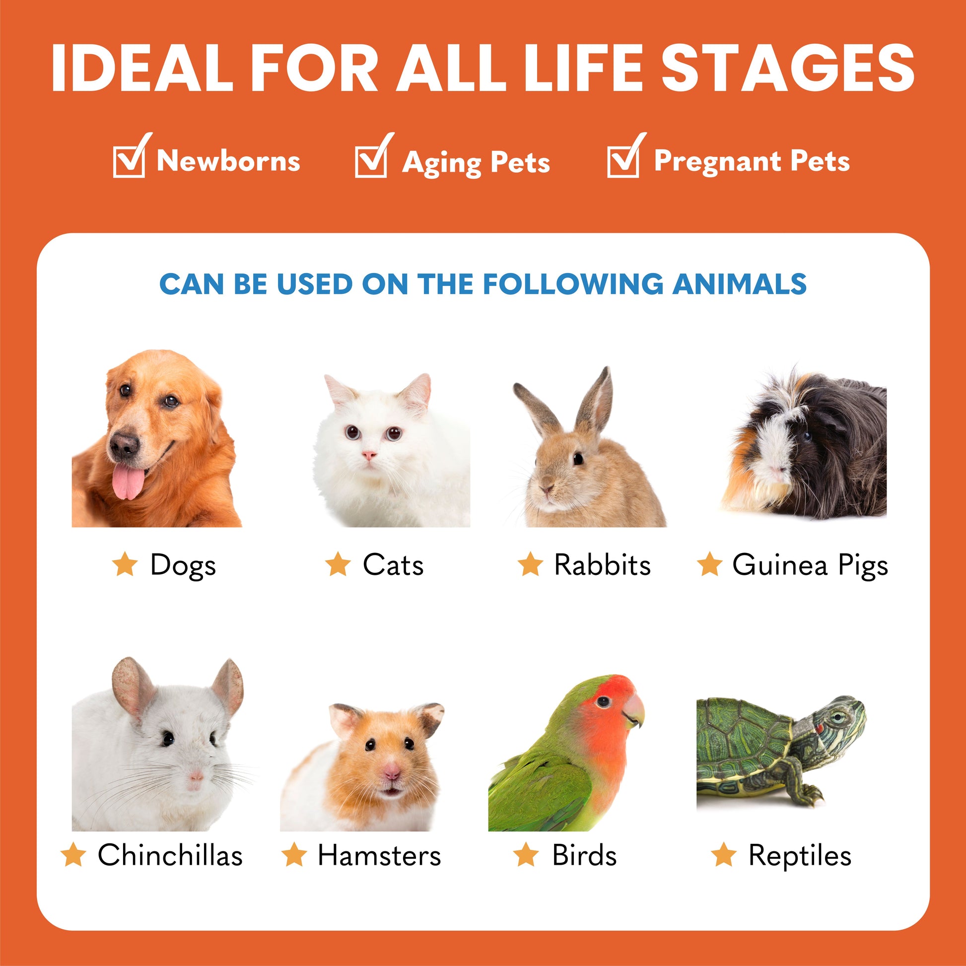 Dogs, cats, rabbits, guinea pigs, chinchillas, hamsters, birds, reptiles.As with all Kala Health products, only human-grade raw materials sourced from the USA are used.