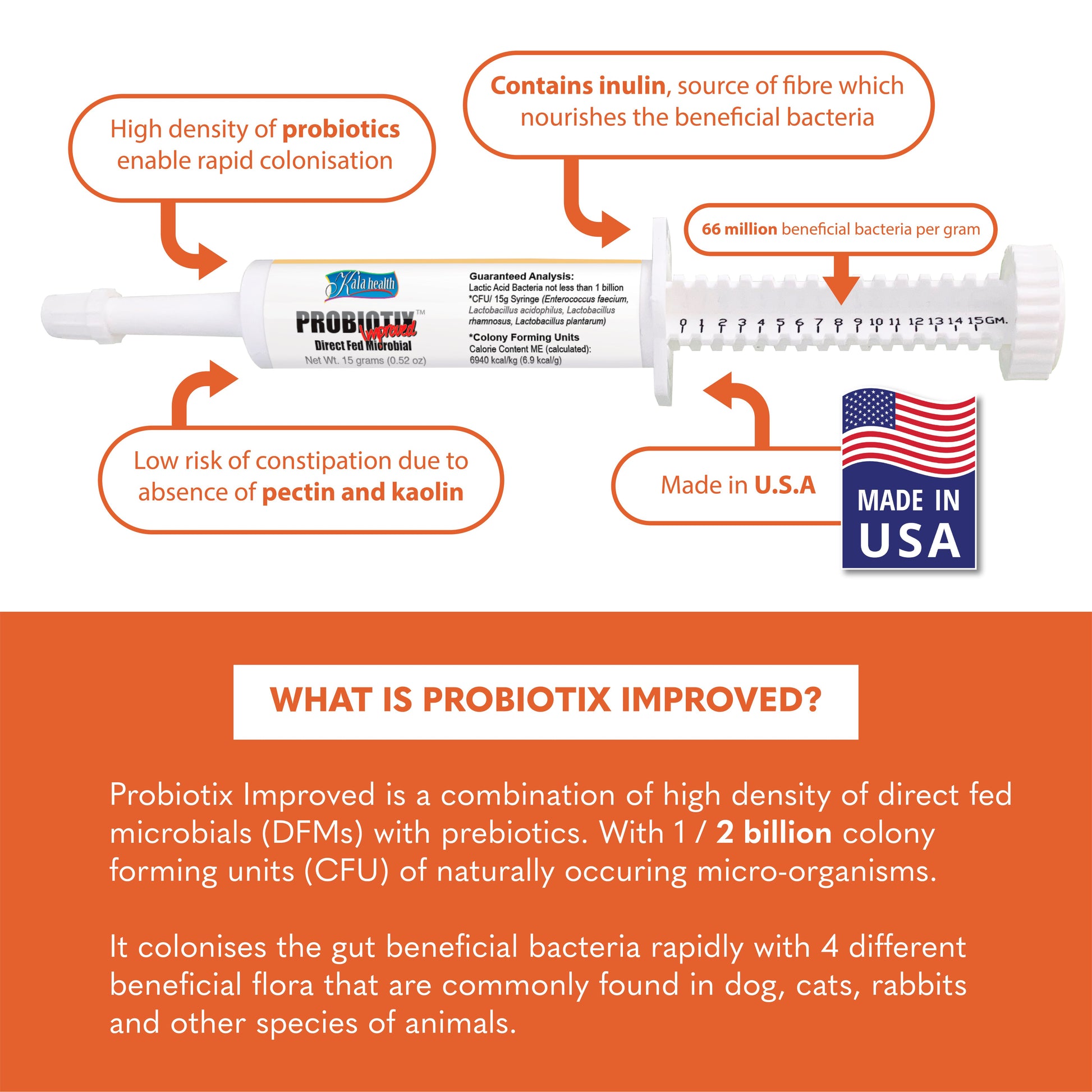 • Lactic Acid Bacteria not less than 1 billion *CFU/15g Syringe (Enterococcus Faecium, Lactobacillus Acidophilus, Lactobacillus Rhamnosus, Lactobacillus Plantarum)Ingredients: