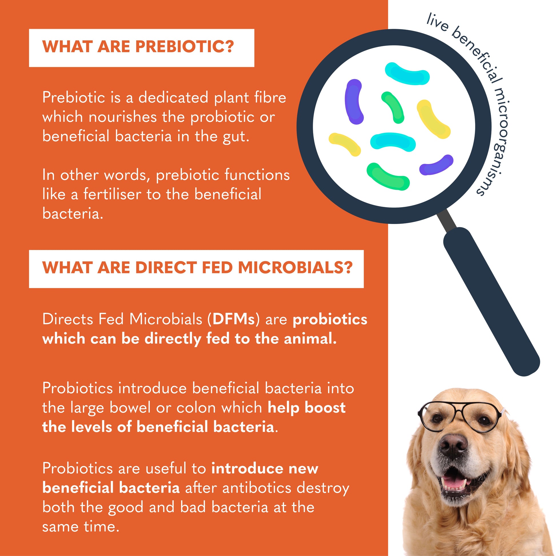 PROBIOTIX® IMPROVED is a high-density combination of Direct-Fed Microbials (DFMs) with prebiotics. With 66 million beneficial bacteria in each gram, PROBIOTIX® IMPROVED rapidly colonises the gut with beneficial bacteria, including 4 different beneficial flora that are commonly found in dogs, cats, rabbits and other species of animals
