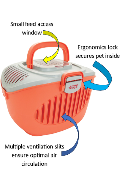Features Provides a safe and comfortable haven for small pets on the go Made of durable, chew-resistant plastic Comfortable handle allows easy carrying Ergonomic lid lock secures pet inside Multiple ventilation slits ensure excellent air circulation Small feed access window Suitable for small animals such as hamsters, gerbils, guinea pigs Also suitable for budgies and cockatiels For pets up to 5 kg (11 lb) Size: 36 cm L x 28 cm W x 25 cm H (14" x 11" x 9.8")