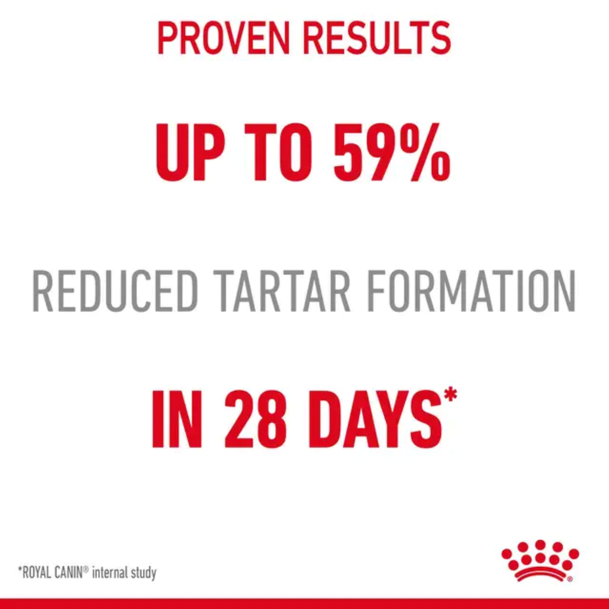 PROVEN RESULTS: The exclusive use of ORAL CARE is effective after 28 days: up to 59% * reduction in scale formation. * Royal Canin Internal Study, 2005 - Compared to a control food for adult cats not containing Oral Care active ingredients and measured on the most vulnerable teeth.